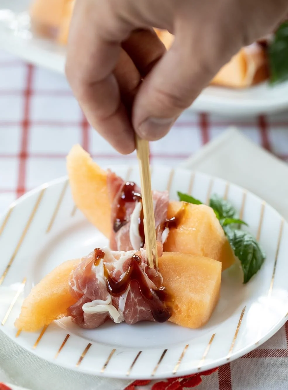 sweet melon cubes wrapped in delicate slices of prosciutto, served as fresh and sophisticated bites. a classic pairing that balances savory and fruity notes — perfect for light appetizers with Mediterranean flair.