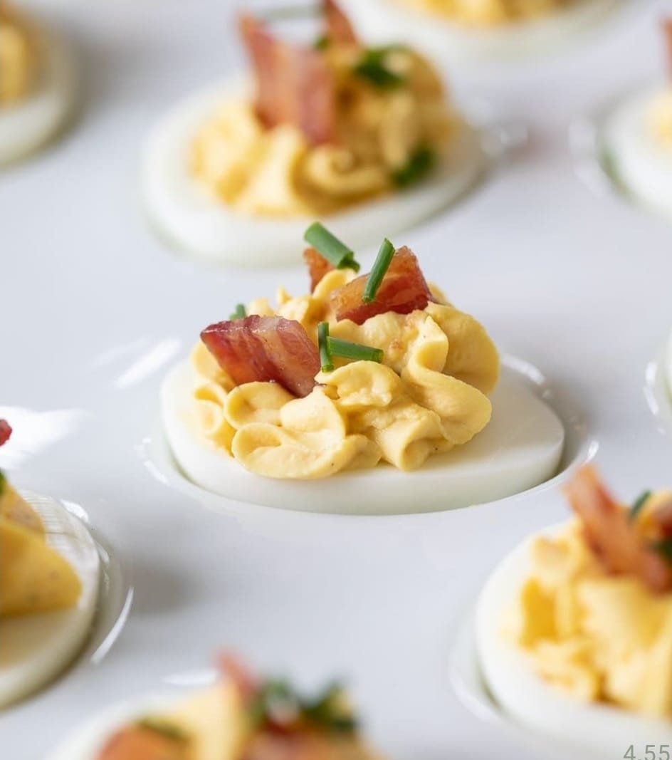 hard-boiled egg halves filled with a creamy blend of yolk, mayonnaise, and spices, topped with crispy bacon bits. a reinvented classic with smooth texture and bold flavor — perfect for appetizers with personality.